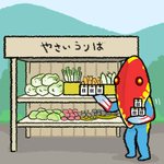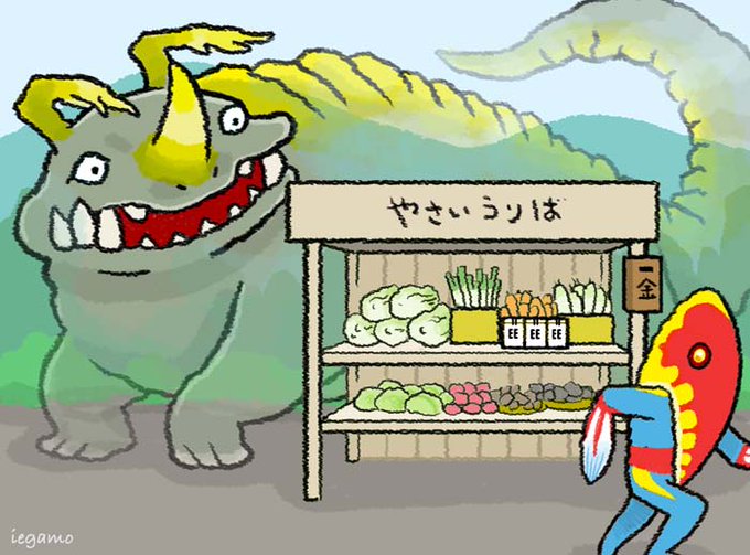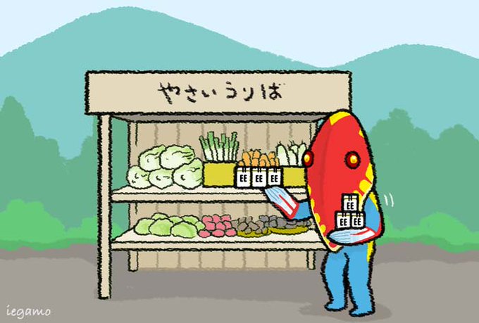 ウルトラセブン第8話【狙われた街】#ファンアート うっかりタバコの自販機が無い場所を拠点にしてしまい、仕方なく野菜の無人販売所に(勝手に)タバコを置くことになったメトロン星人がいる世界線。 #妄想 #メトロン星人55周年