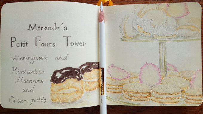 ミランダのプチフール🧁 疲れた時は甘い物が食べたくなりますね🥺過度に疲れた時にシュークリームを食べながら甘〜いココアを飲む☕という糖分の過剰摂取をよくしていました😅 #ブリティッシュベイクオフ #TheGreatBritishBakeOff #season1 #色鉛筆 #イラスト #マカロン #メレンゲ #シュークリーム