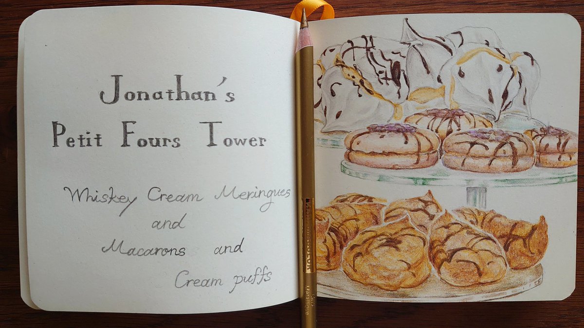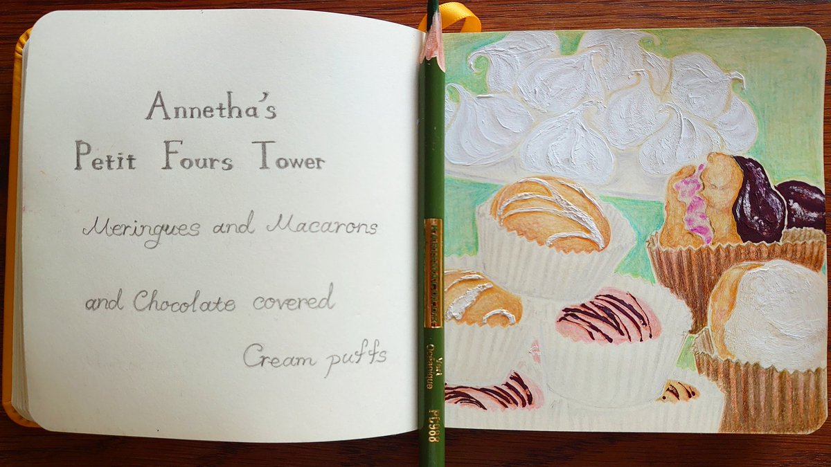 アニータのプチフールタワー🧁✨ 4時間半で3種類のお菓子タワーを作れって…😭鬼のような課題👹!! #ブリティッシュベイクオフ #TheGreatBritishBakeOff #season1 #色鉛筆 #イラスト #illustration #プチフール #petitfours #メレンゲ #merengue #マカロン #シュークリーム