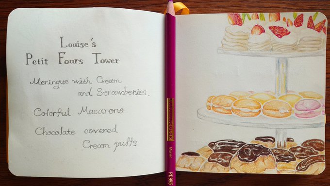 ルイーズのプチフールタワー🧁✨ 皆様GWいかがお過ごしでしょうか? 私はいつも通りです!明日はお仕事です😣 #ブリティッシュベイクオフ #TheGreatBritishBakeOff #season1 #色鉛筆 #イラスト #illustration #プチフール #petitfours #メレンゲ #merengue #マカロン #シュークリーム