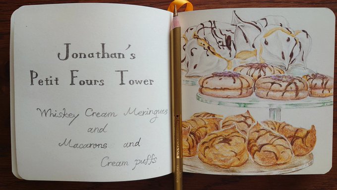 ジョナサンのプチフール🧁 メレンゲにウイスキークリームを合わせていましたが、ウイスキーと甘い物って合いますよね😋ウイスキーボンボンって定期的に食べたくなります💖🍫 #ブリティッシュベイクオフ #TheGreatBritishBakeOff #season1 #色鉛筆 #イラスト #illustration #メレンゲ #マカロン