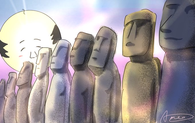 今日は水曜日ね。疲れが溜まってダルくないかしら? キツイだろうけど今日も一日頑張って生きてみましょ。 おはようみんな、おはよう日本、おはようモアイ像。 #illustraion #イラスト好きさんと繋がりたい #冬の創作クラスタフォロー祭り #日の出おじさん #モアイ像