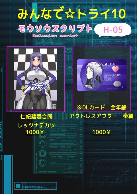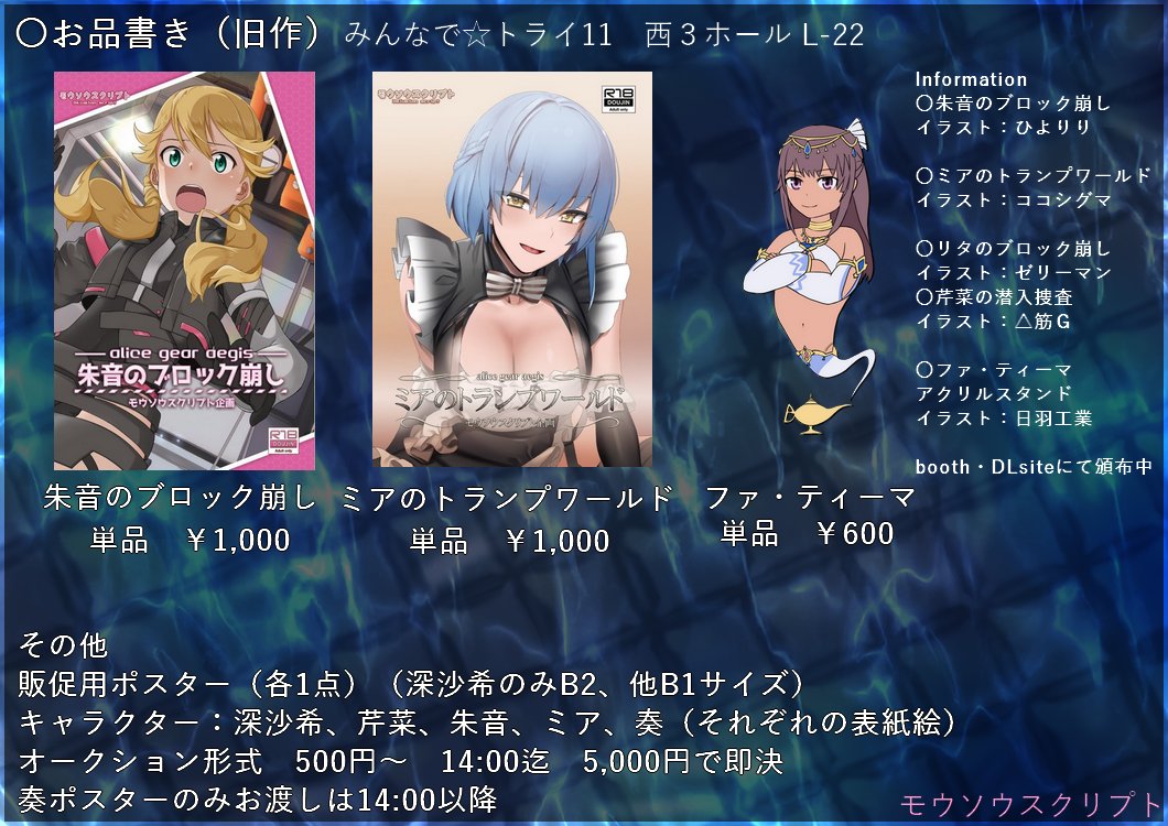 「みんなで☆トライ8」にて以下の作品を頒布致します。 ※Windows専用 両方頒布価格は1,000円です。 ・ミアのトランプワールド ・アクトレスアフター 〜地衛理編〜 頒布価格は1,000円です 両作品におまけの「カエデが斬る!!」(布地縮小ver.)が同梱します。(局部は出ないよ) 続 #モウソウスクリプト