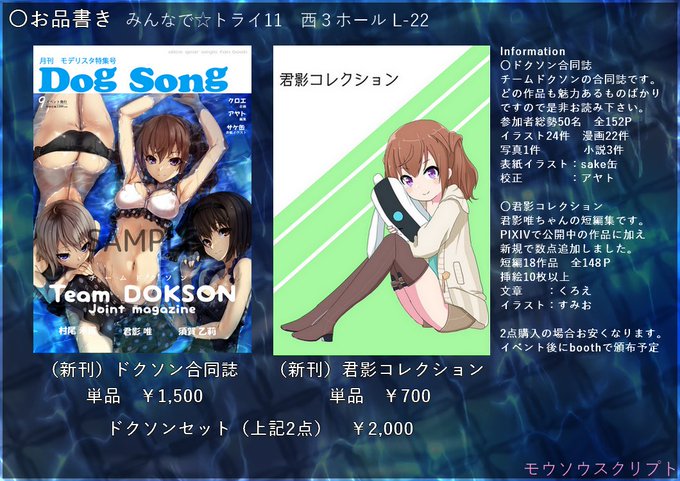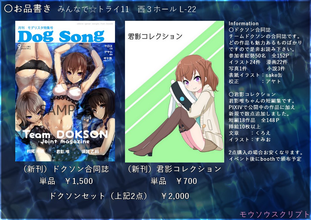 【お品書き】 みんなでトライ11のお品書きです。 〇新作 ・Dog Song(ドクソン合同) ・君影唯コレクション(小説) ・アクトレスアフター奏編(ノベルゲーム) 〇旧作 添付画像をご確認ください また販促用ポスターのオークション予定です よろしくお願いします #ドクソン合同 #モウソウスクリプト