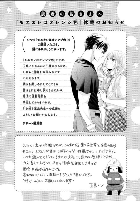 本日発売のデザート10月号に #モエカレはオレンジ色 番外編を載せていただいてます。主役はまさかの新堂さん。消防的台所事情。好き放題描かせていたきました😆 そして先日もお伝えしましたが今秋に出産のため来月号からしばらく休載させていただきます パワーアップして戻って参ります‼️🍊🚒