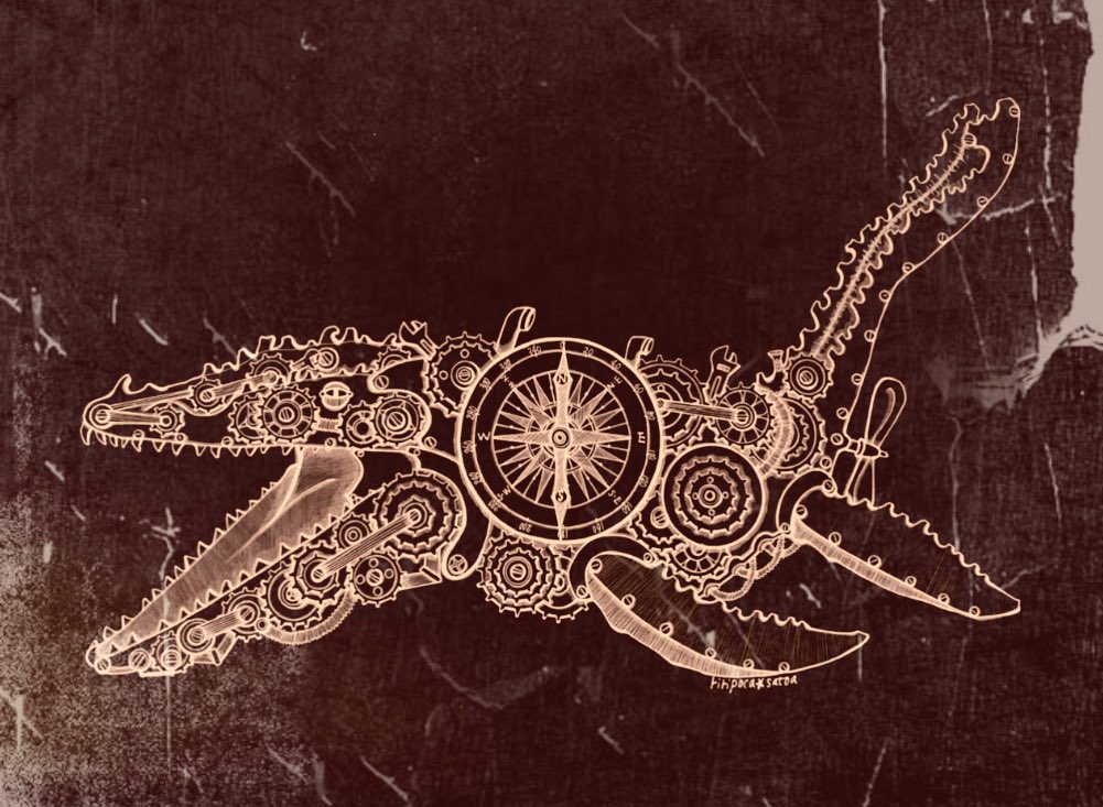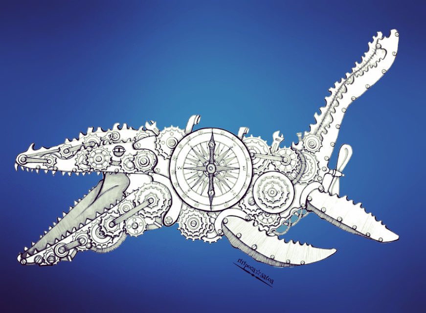 今日もお疲れ様でした✨✨ 朝からのTwitter不具合からやっと抜け出しました(^^;; ⚙モササウルス⚙ #スチームパンクイラスト #歯車イラスト #ペン画 #モササウルス #アナログ絵 #絵かきさんと繋がりたい