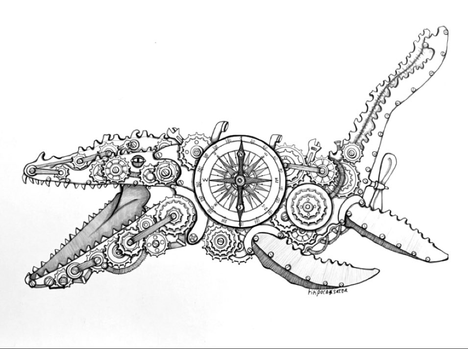 おはようございます✨✨ 今日もよろしくお願いします♪ ⚙モササウルス⚙ #スチームパンクイラスト #歯車イラスト #モササウルス #ペン画 #アトリエの系譜 #イラストレーターさんと繋がりたい