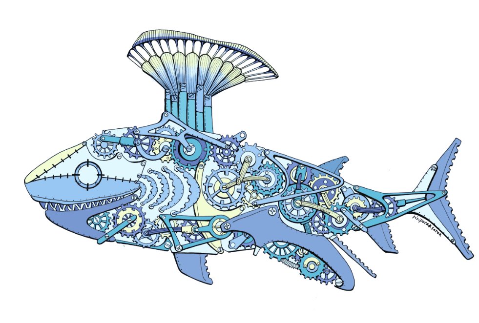 おはようございます✨✨ 今日もよろしくお願いします♪ ⚙古代生物⚙ #スチームパンクイラスト #歯車イラスト #ペン画 #ダンクルオステウス #ステタカントゥス #レビアタン・メルビレイ #モササウルス