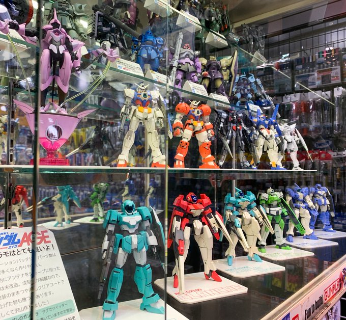 上野駅前ヤマシロヤさんに近年趣味で作った #ガンダムAGE シリーズを展示して頂きました!アンテナ削った以外は基本的にそのまま塗装したり成型色のまま仕上げたり。素直に作るだけでカッコいいAGEプラモの魅力を少しでもお伝え出来れば幸いです。 #モデリズムのガンプラ