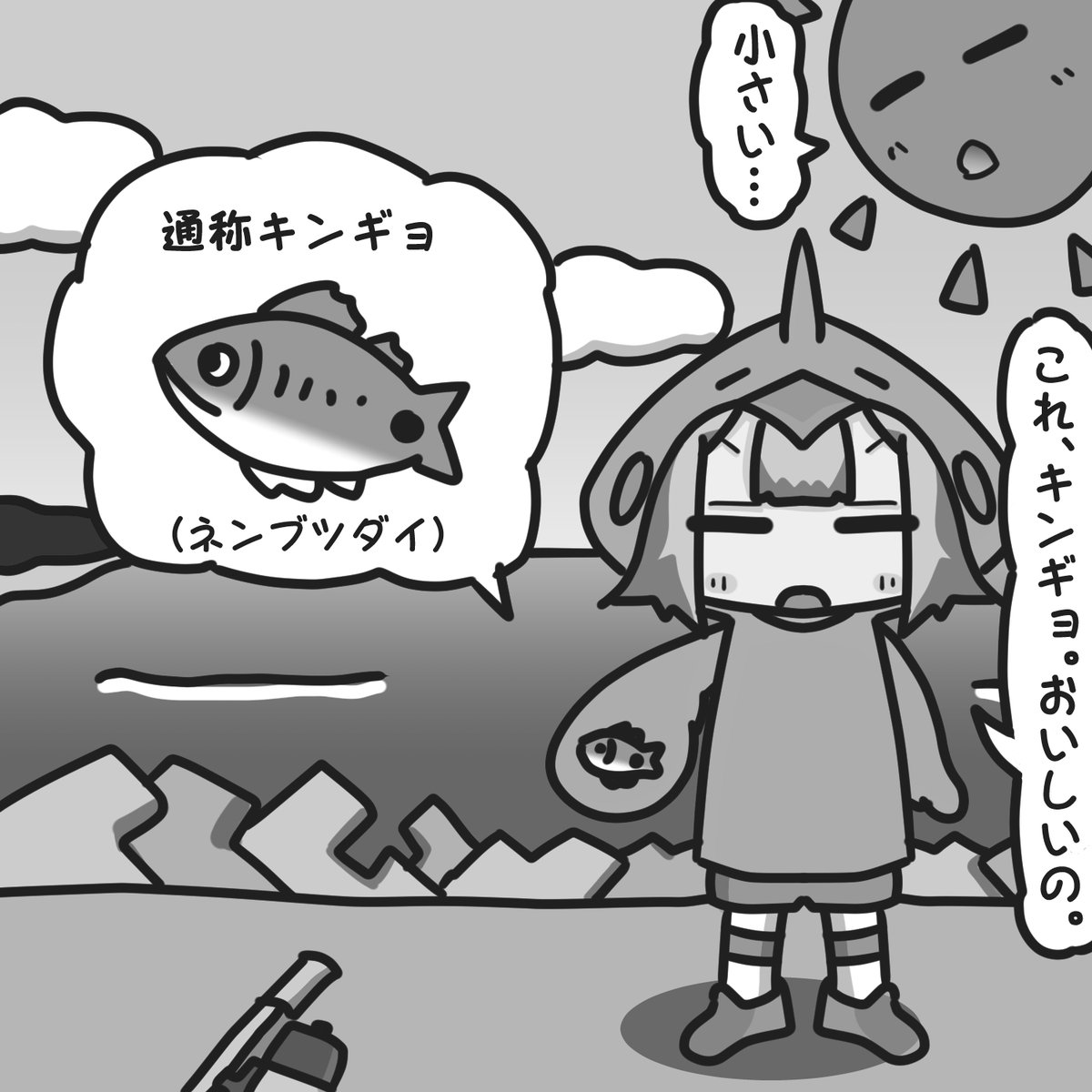 海岸で釣りするならキンギョが気軽に釣れていいのですっ😊 二度揚げで骨まで食べれておいしいのですっ☺️ #イラスト #落書き #モノクロ #絵描きさんと繋がりたい #イラスト好きさんと繋がりたい