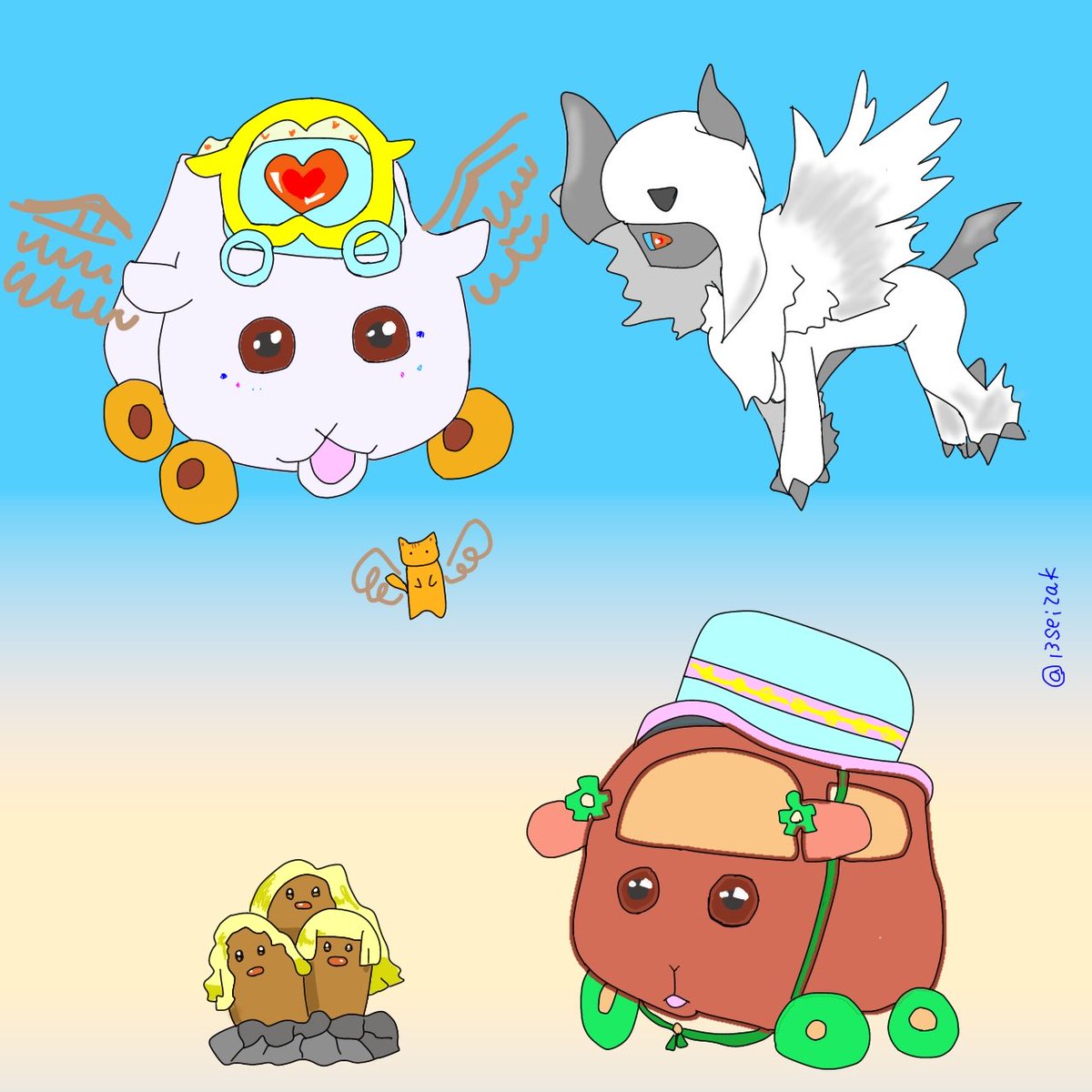 火曜日は、モルカーの日 モルカー二期おめでとうPUI✨ モルカーとポケモン2 ヒーローみたいなメガアブソルとアビーちゃん🔰 アローラダグトリオと、これはおしゃれなの?と考えるチョコちゃん🍫 #モルカー新作 #モルカーファンアート
