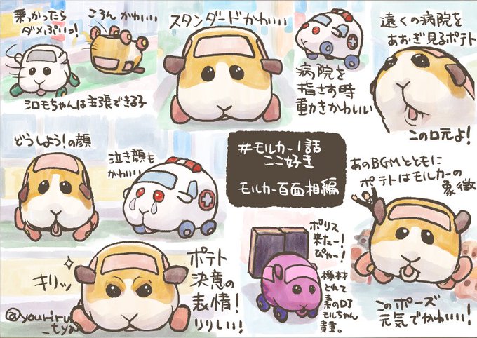 描きそびれてた #モルカー1話ここ好き 描いてきました。モルカー百面相編です。表情豊かなモルカーはかわいいぞ。動作も含めて全身で感情表現するモルカーはいいぞ。行列の一台一台皆かわいいぞ。 何気にDJモルちゃんのドライバーがやってたゲーム……音ゲーなのか育成ゲーなのか気になります。