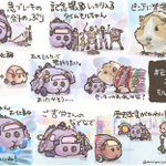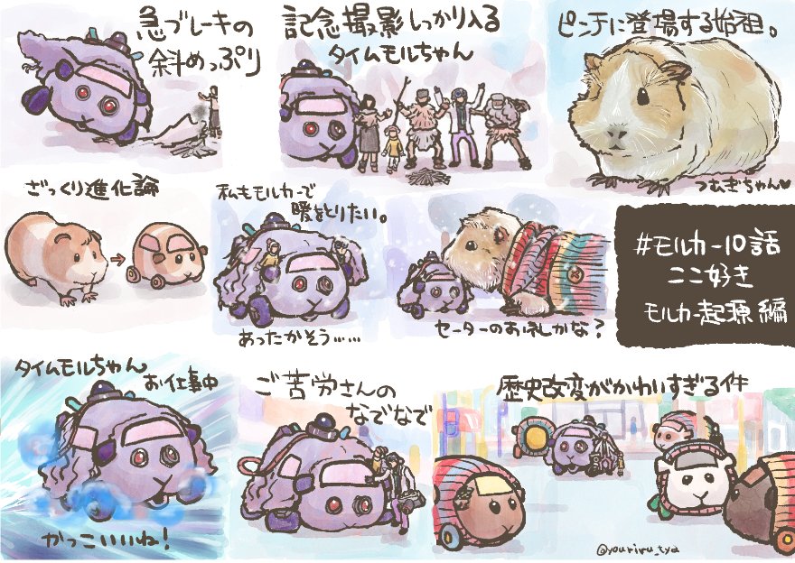 #モルカー11話ここ好き 描けた……モルカー起源編です。モルカーの始祖だったモルモットはかわいいぞ。ざっくり進化はいいぞ。 この他に壁画とか原始の人達怒られる一行とかタイムモルちゃんがポテトとすれ違った時のお鼻の動きとかポテトのニットから覗くおしりとかテディ姐さんに駆け寄るシロ文字数