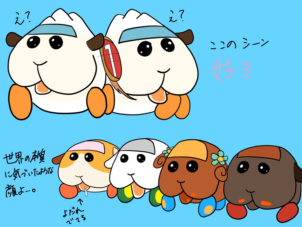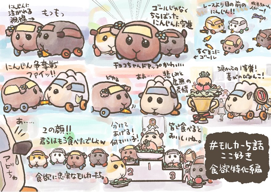 #モルカー5話ここ好き 食欲特化です。食い意地の張ったモルカーはかわいいぞ。食欲旺盛はいいぞ。 他の好きな所はポテトとぶつかってムッとするチョコちゃんとか、プールからぴょこっと顔出すシロモちゃんとか、壁に突っ込んだテディ姐さんとか、泣きながらとぼとぼゴールしたアビーちゃんとか文字数