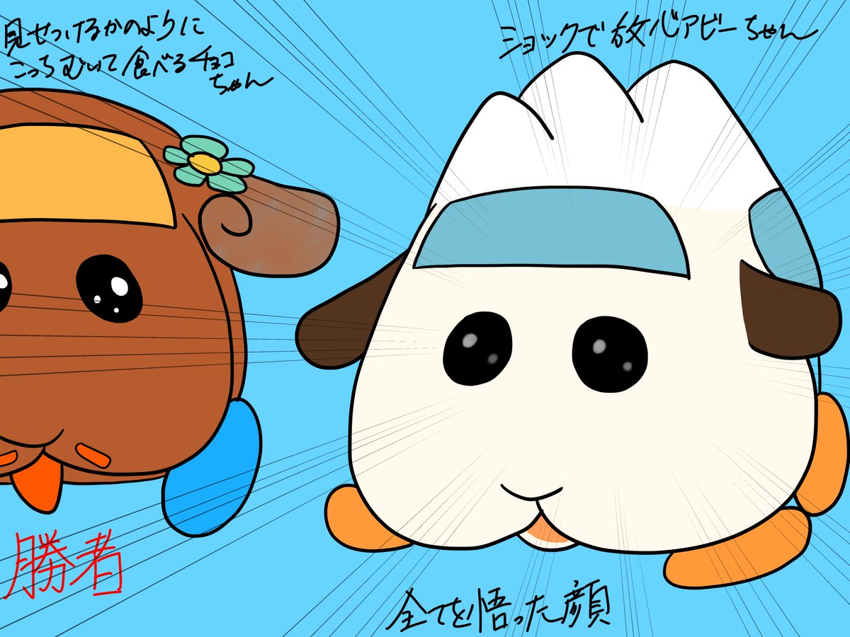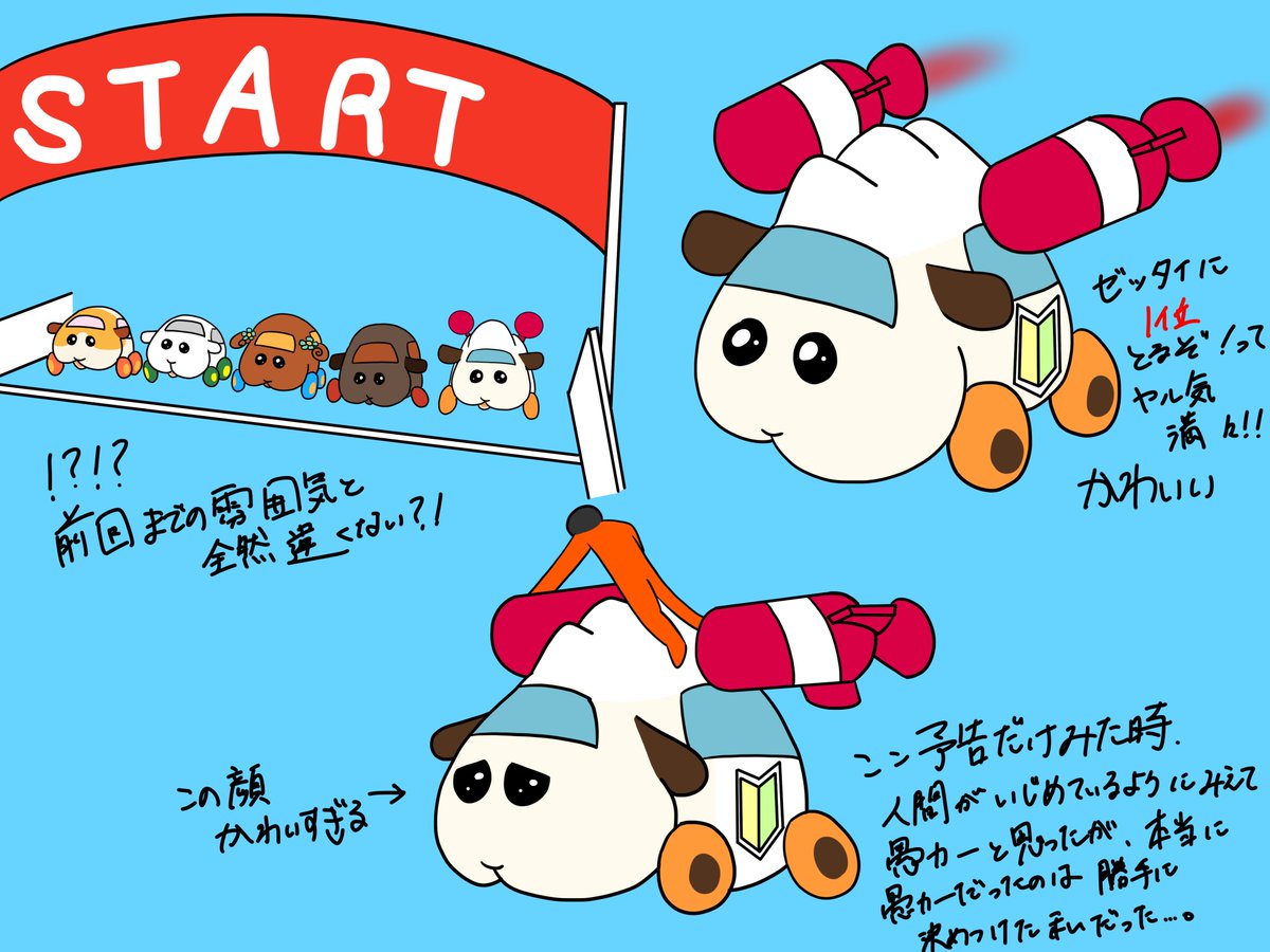 再再放送5話感想絵 急にレース回が来て驚いたよ。 アビーちゃんとチョコちゃんの🥕の奪い合い、アビーちゃんの方が圧倒的有利な所銜えているのに負けちゃうのが本当に好き。 #モルカーファンアート #モルカー5話ここ好き