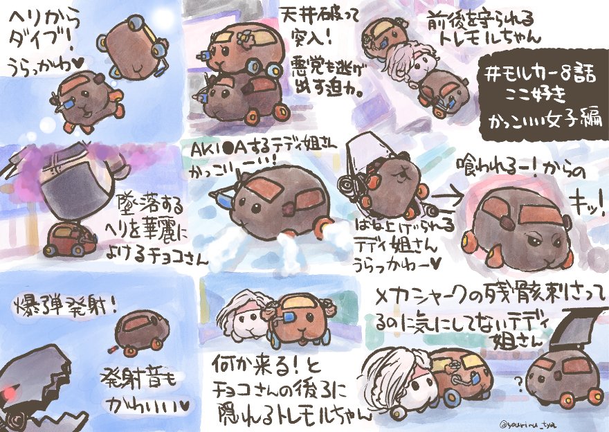テディ姐さんが想像以上に大暴れしているのがとても可愛いです!ストップモーションアニメでこんなダイナミックに動かすの本当にすごいと思いました!サメちゃんもかっこいい可愛いです!#イラスト #モルカーファンアート #モルカー #モルカー8話ここ好き
