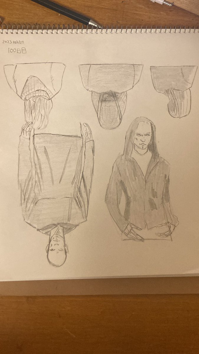 #モルフォ #100日チャレンジ 100日目 #イラスト練習 後ろ姿のパーカー3ポーズは逆さ模写で挑戦 アタリも取らずに「線」としてだけ見るの、心許なさすぎたんですがひっくり返したら………うーん?