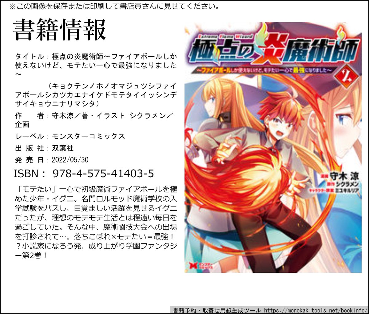 【🔥単行本のお知らせ🔥】 コミカライズ連載中の 「極点の炎魔術師~ファイアボールしか使えないけど、モテたい一心で最強になりました~」 ②巻 5月30日発売です! 紙&電子どちらもありますので よろしくおねがいします! futabasha.co.jp/booksdb/book/b… #モンスターコミックス