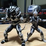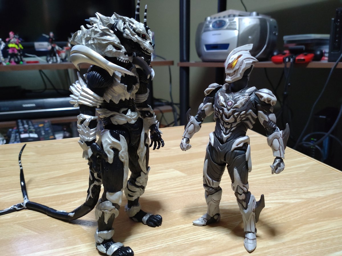 配色が似てる(ベリアルは黒じゃなくてちょっと灰色っぽいけど) あんまり敵役のフィギュア買わないからベリアルにとっては貴重な後輩 カルミラさん?彼女はヒロインでしょ? #オモ写 #ウルトラマンベリアル #モンスターX