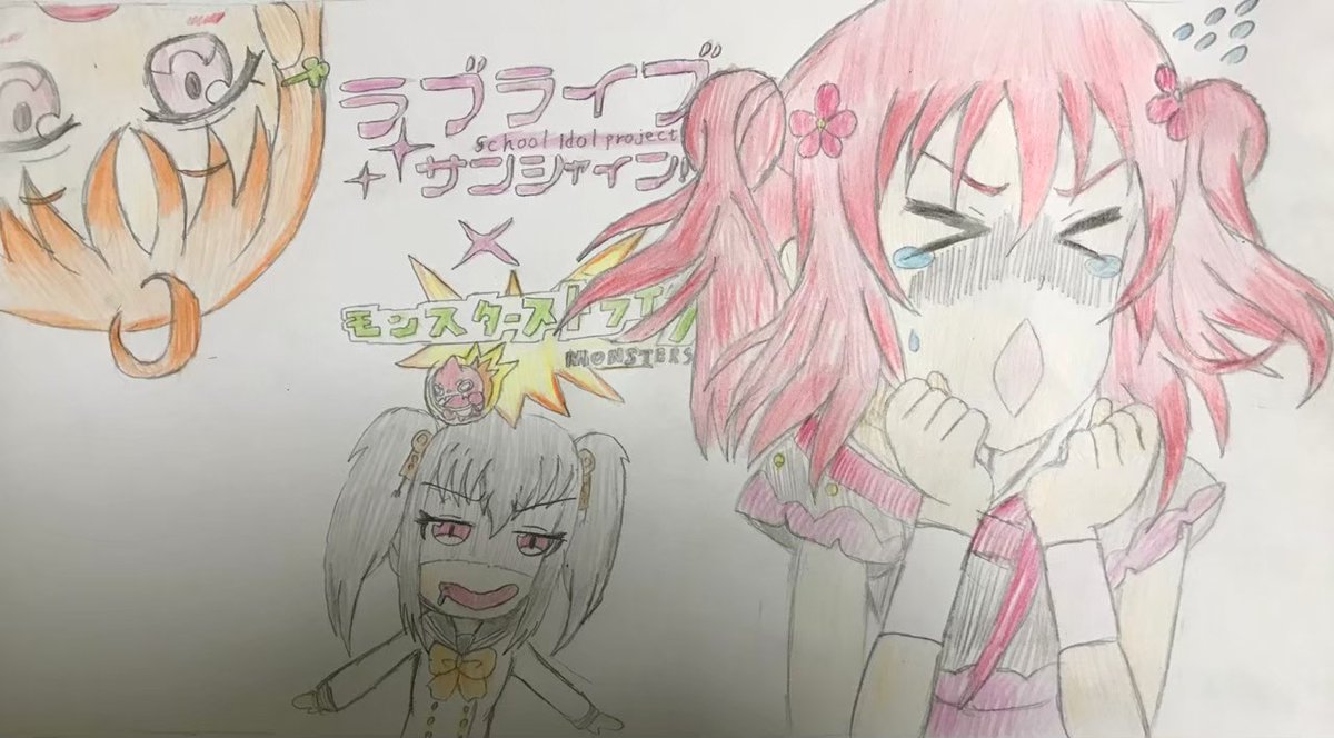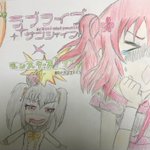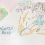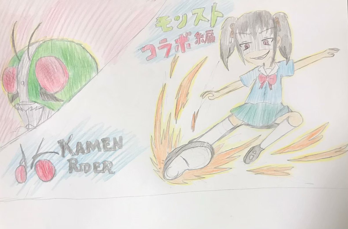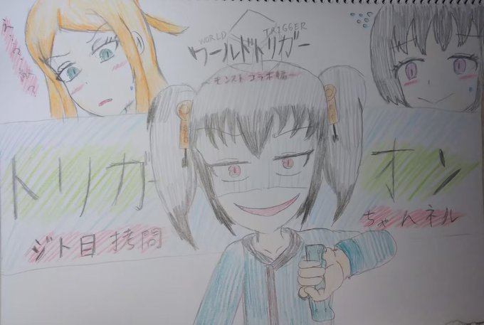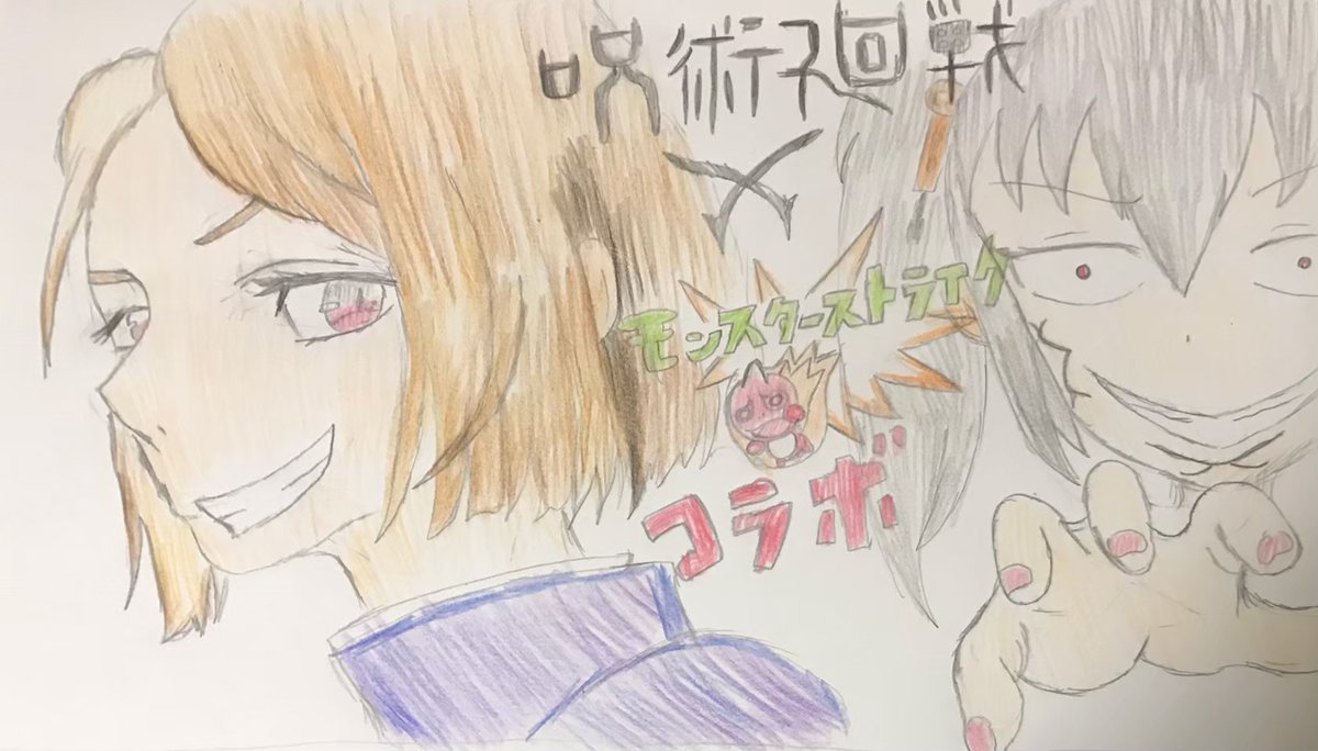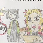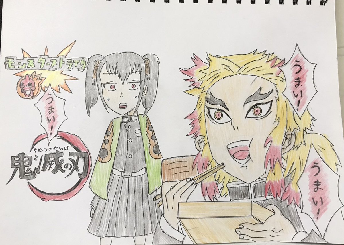 #絵描きさんと繋がりたい #モンストコラボ #鬼滅の刃 #ミラティブ配信用サムネ 鬼滅の刃コラボ第2弾用のサムネ完成しました。私のオリキャラの初代拷問ちゃんに鬼殺隊の服を着せて、「うまい!」を言っている煉獄さんの隣りに立たせました