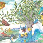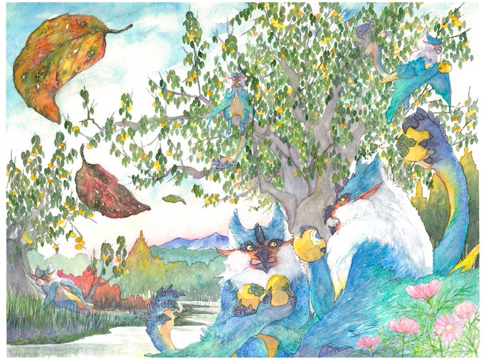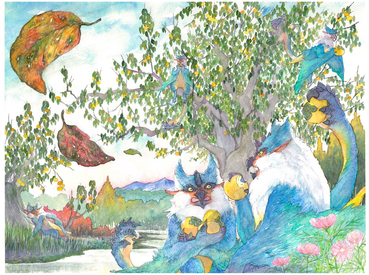 #モンハン文化祭2022 お時間となりました。わたくし、美術部 クルにぃさんがお届け致しますは「ビシュテンゴの里」今年も柿が大豊作でした❗️(リアルに毎日食べてたし) アナログ水彩で描きました😃柿だけに (゜ロ゜)