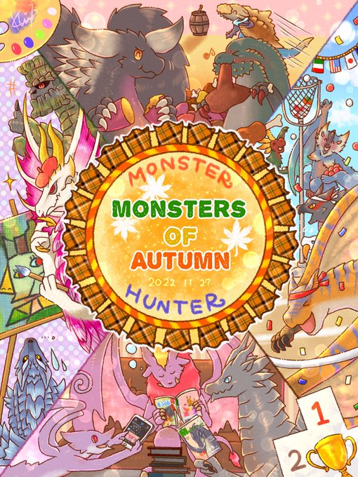 #モンハン文化祭2022 #モンハン 【モンスターズ ハーベスト!】🍁🍄🍇🍠 11/26.15:00担当のJUMBOと申します🐸 秋といえば?実りの秋!食欲の秋!✨ ライズ(大社跡)とサンブレイク(城塞高地)のモンスター達でハーベストフェスティバルを描きました👨🌾 この後の素晴らしい作品もお楽しみに!😉