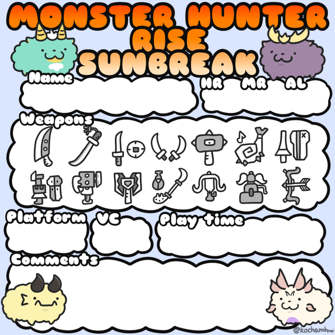 モンハン自己紹介カード作りました☁️ 使用許可はいらないのでご自由にお使いください🌱 ※ALは傀異研究レベル(Anomaly Research Level)の略です。勝手に略しました。 #モンハン自己紹介カード