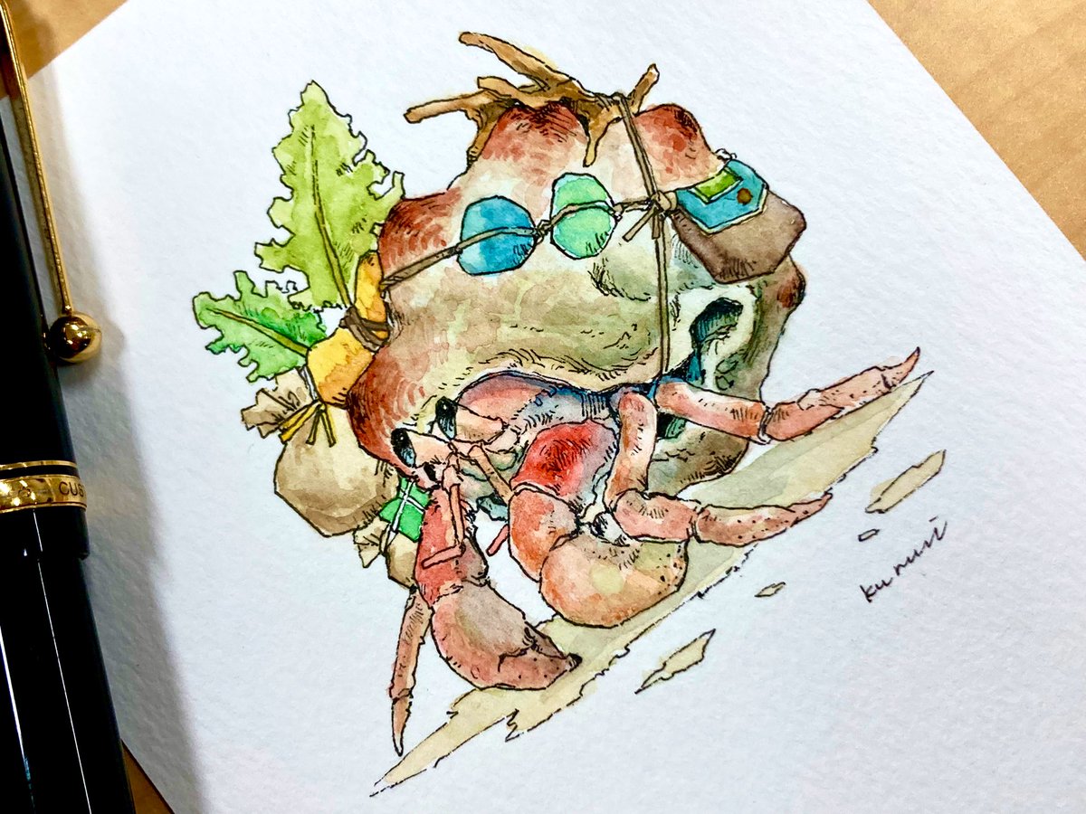 おはばコ~☀️ 今日は浜辺でヤドカリさんごっこ! 偶然出会えたヤドカリさんのおうちがステキだったから思わず声掛けちゃった(*´艸`) #お家訪問 #入れないの分かってるけど言いたい #あおばコ #一日一絵 #ヤドカリ #イラスト #OCイラS #みんなで楽しむTwitter展覧会