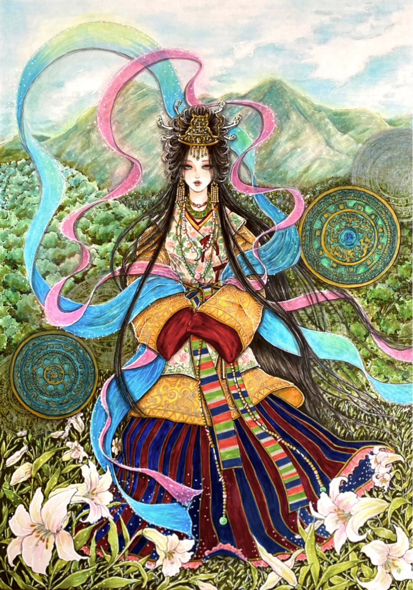 「振媛」(A3サイズ) 古墳時代の振媛をモチーフに、背景には丈競山と銅鏡を描きました🥰 #オリジナルイラスト #illustraion #ヤフオク出品中 #みんなで楽しむTwitter展覧会 #イラスト好きな人と繋がりたい #夏の創作クラスタフォロー祭