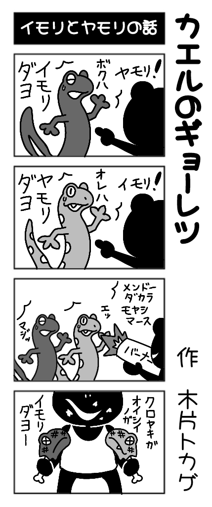 @chiplizard1 作 4コマ漫画 【カエルのギョーレツ】 twitterにて1日1話公開中! 第9回は 『イモリとヤモリの話』です。 何卒よろしくお願いいたします。 #漫画が読めるハッシュタグ #4コママンガ #4コマ漫画 #カエルのギョーレツ #イモリ #ヤモリ #木片トカゲ #宣伝