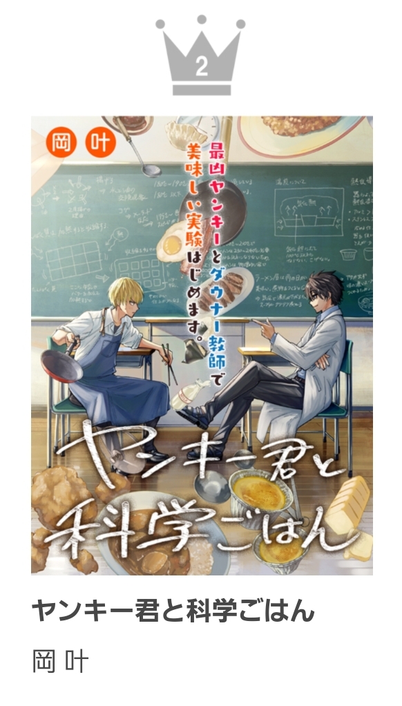 そしても一個お知らせです pixivコミックランキング2022グルメ部門2位に「#ヤンキー君と科学ごはん」が入りました。ありがとうございます。 集計期限の9/30ってまだ1話しか載ってなかった時期なんじゃないかな…ありがたいことです。 comic.pixiv.net/news/25JW6u528…