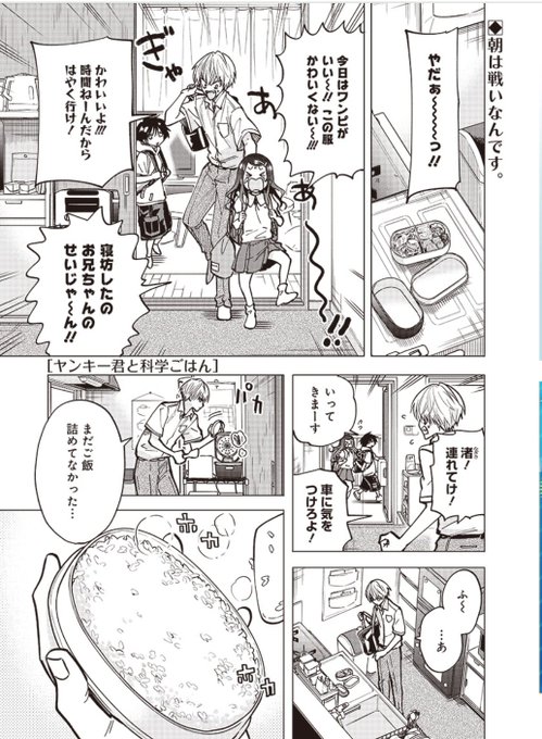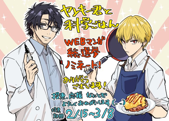 今日も一枚🍚 #WEBマンガ総選挙 に #ヤンキー君と科学ごはん がノミネート中です。 ↓から一日一票投票できるので、よければ応援・投票よろしくお願いいたします🙇♀️ webmanga-sousenkyo.com/vote/44 今日発売のジャンプにヤンキー君と科学ごはんの広告が載ってる~!!🎉🎉 twitter.com/3knt28/status/…