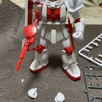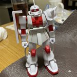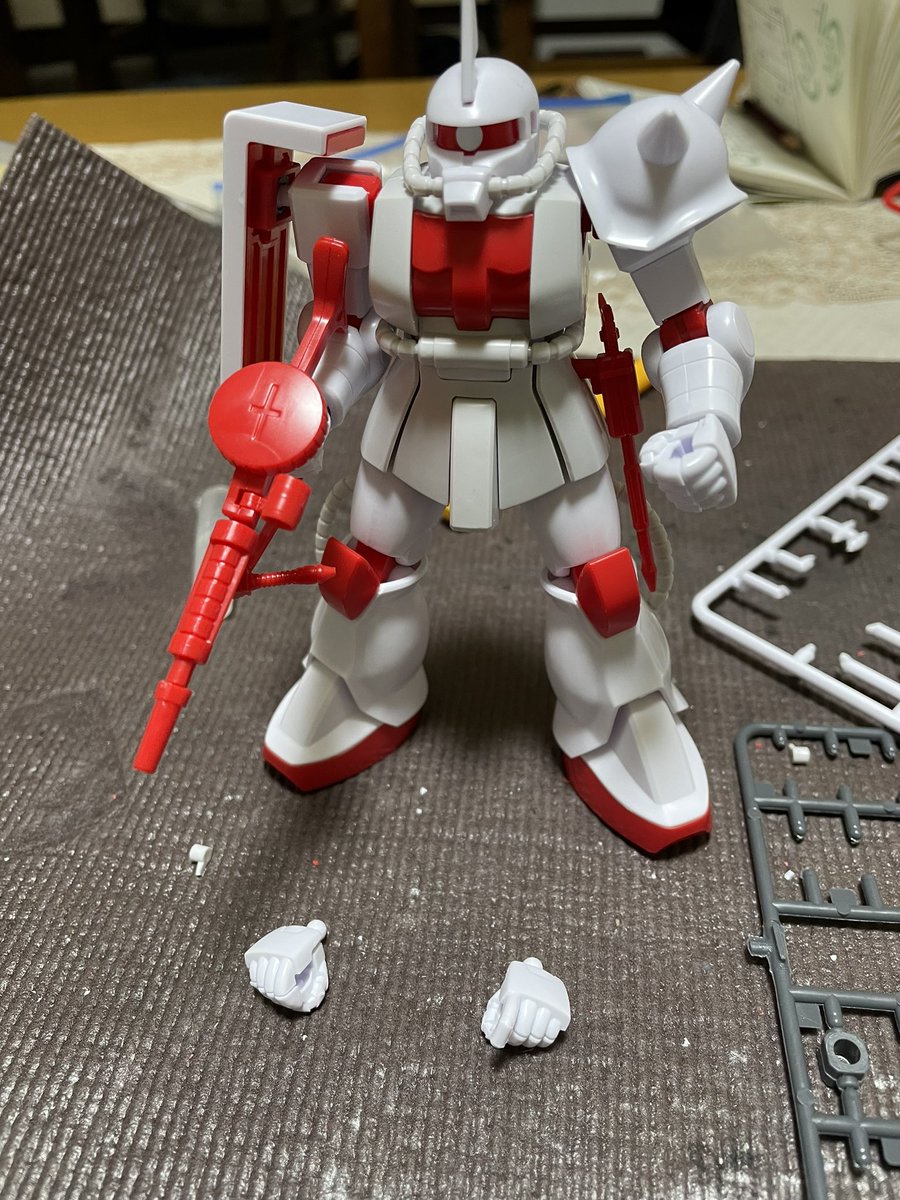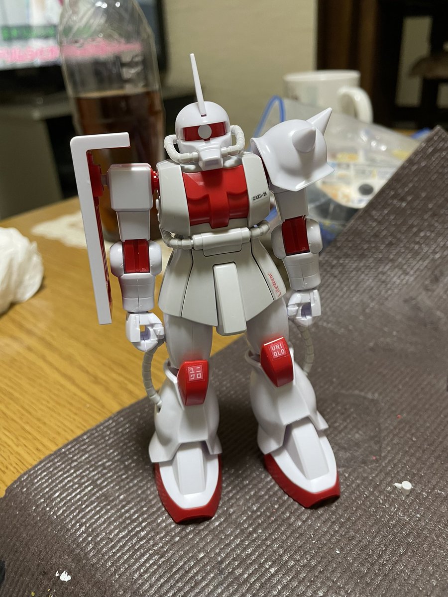 ついでにこのキットザクバズーカが何故かオミットされててありません。なのに銃持ち手がもう一つあるわ、バズーカラックあるわチグハグ、そしてシール貼ると一気にシャアザクと言うより柳井社長専用ザクというような雰囲気に変わる。#ガンプラの画像貼るとRTされると聞いて #シャアザク #ユニクロ