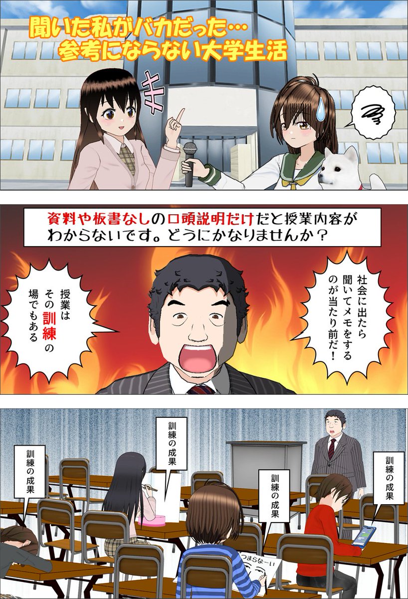 言いたいことはわかるが本末転倒ということ。 大学の授業のあり方、授業のユニバーサルデザインのことをブログにて説明→daigakusei-skill.com/e2oq #ユニバーサルデザイン #comipo #学校 #教育 #漫画 #漫画が読めるハッシュタグ #2コマ漫画 #漫画好きと繋がりたい