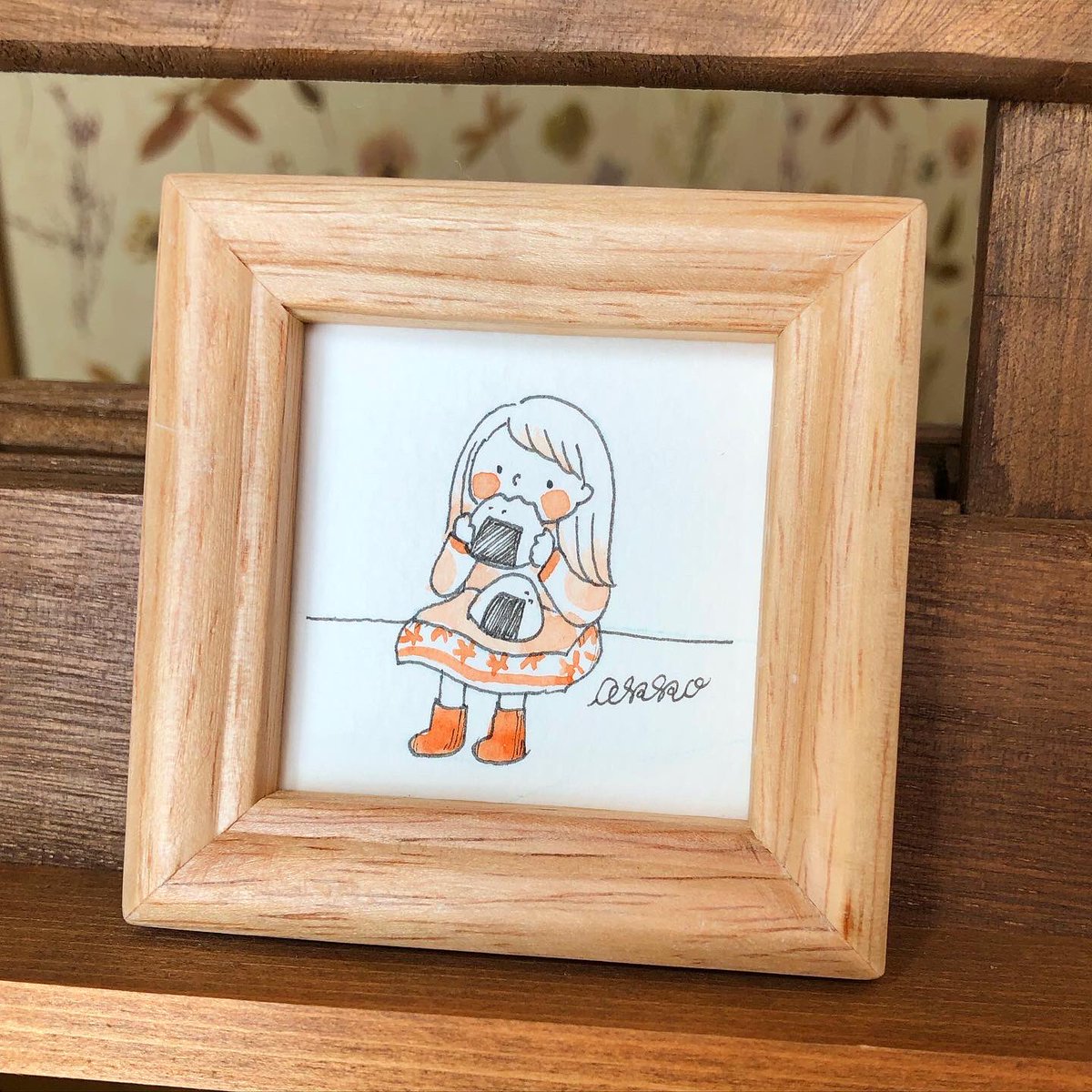 ミニ額原画いろんな子シリーズ。 「太ったかな?」 私は体力ない系すぐお腹空く系の人なので明日のおにぎり何個作るか悩んでます🍙🍙🍙 食べ物で荷物が重くなります💨食べていれば元気! #ヨコハマハンドメイドマルシェ2022 #イラスト #illustrationakko #イラストレーター #原画 #おにぎり