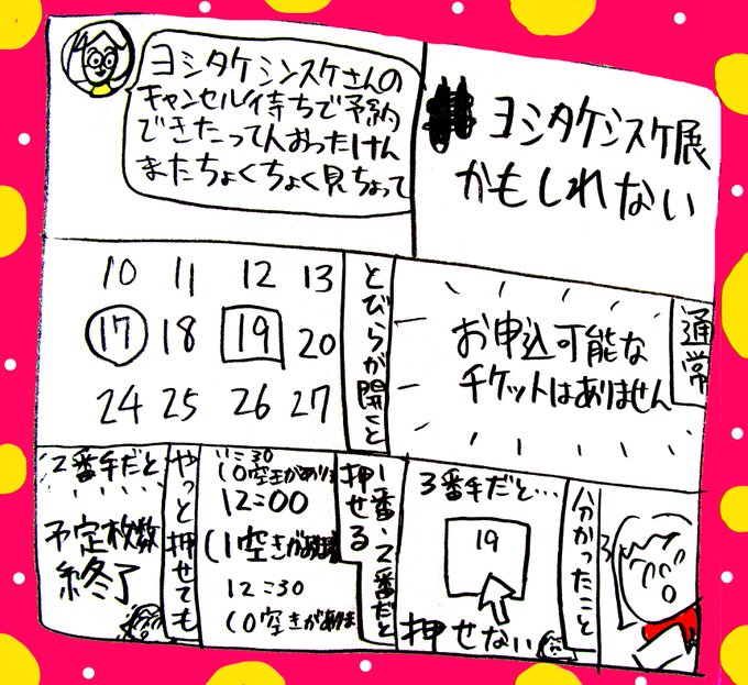 【#ヨシタケシンスケ展かもしれない】 チケットをとるのが超大変 やっと押せるようになっても、3番手だと次に進めない 2番手は押せても、予定枚数終了で買えない 『1空きがあります』は驚き!『2空きがあります』は奇跡! #ヨシタケシンスケ展 #市立伊丹ミュージアム #漫画が読めるハッシュタグ