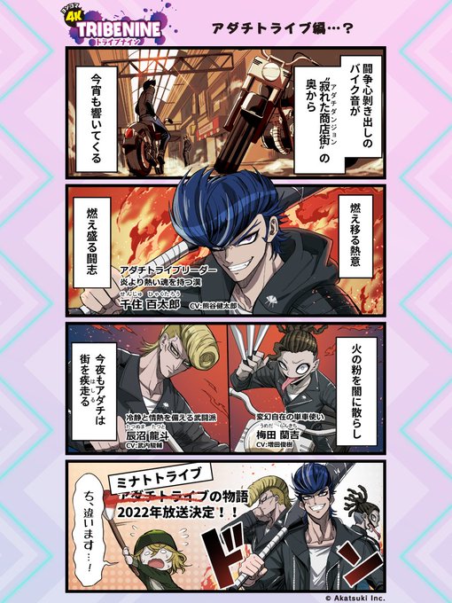 ✏️#ヨンコマトライブナイン ║𝟰𝗞 𝗧𝗥𝗜𝗕𝗘 𝗡𝗜𝗡𝗘 ║Vol.14『1月10日よりTVアニメ放送開始!』 アダチトライブ🏍ではなく… ミナトトライブ🗼が主人公❕ アニメ『トライブナイン』 𝟭月𝟭𝟬日よりスタートです🔥 🔙バックナンバー twitter.com/i/events/14449…