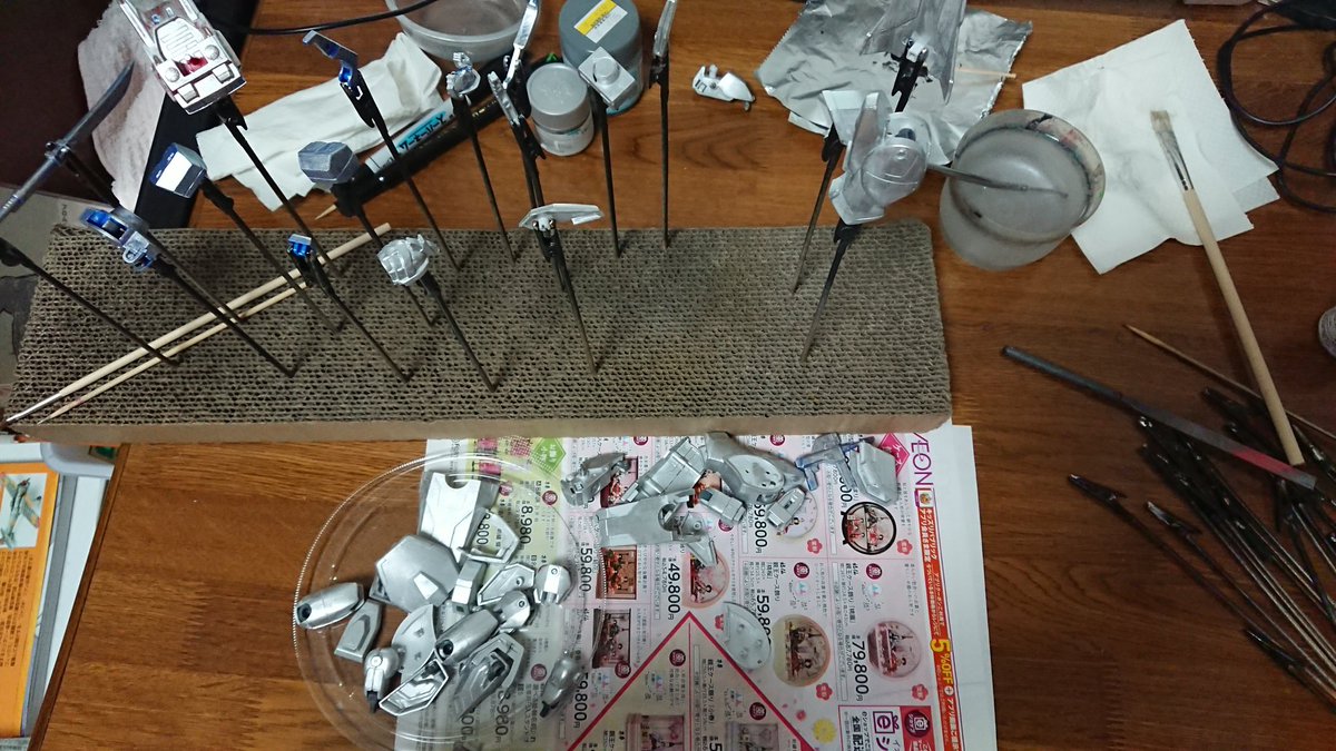 #ガンプラ #ライジングガンダム 下地塗り&チェック~ まだ接着しなきゃいけないトコはあるけど下地塗って傷や隙間をチェックする。案の定アチコチある。 水性サーフェイサーを試してみる。 まぁ乾きは遅いか。銀にグレイは分かりにくいが匂い少ないし気軽に使えそうw