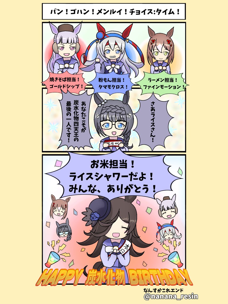 【3コマ漫画】 HAPPY 炭水化物 BIRTHDAY🎉 #ライスシャワー生誕祭 #ライスシャワー生誕祭2022 #ウマ娘 #ゴールドシップ #タマモクロス #ファインモーション #ゼンノロブロイ #ライスシャワー