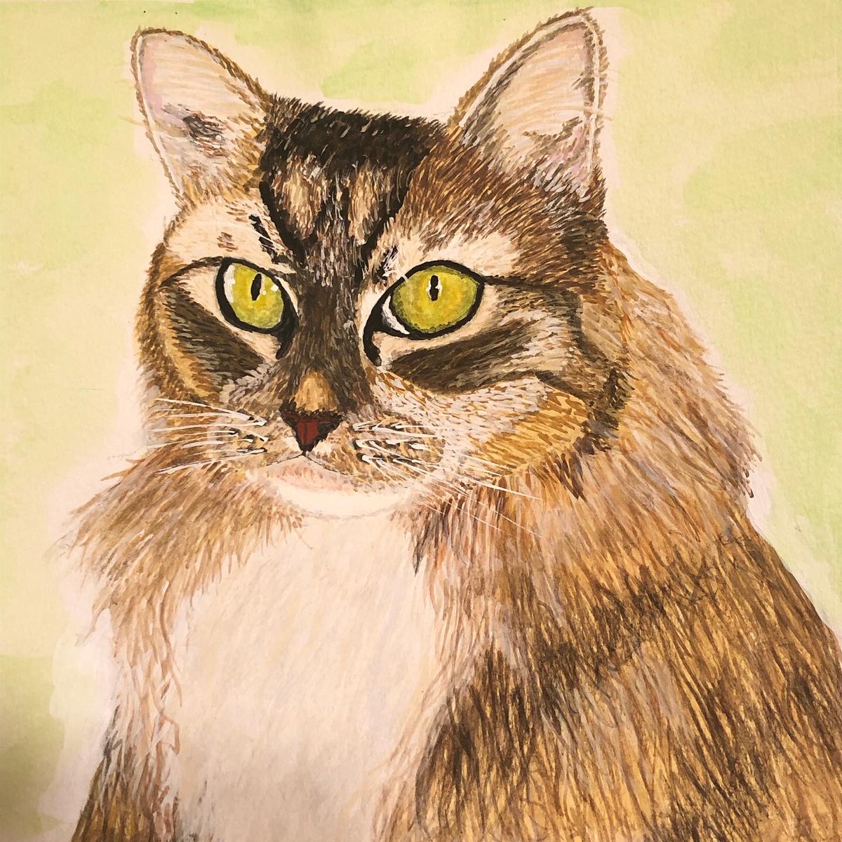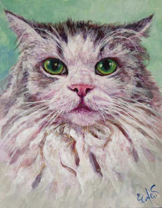 #猫絵 🐈🖼新作です “Chartreuse Eyes”(パネルにアクリル、F0) モデルは #ラガマフィン の女の子😻ラフタッチで手描きアナログ感を強調しています😅このスタイルの絵をシリーズ化予定💖 #絵描きさんと繋がりたい #猫好きさんと繋がりたい #アナログ絵 #アクリル画