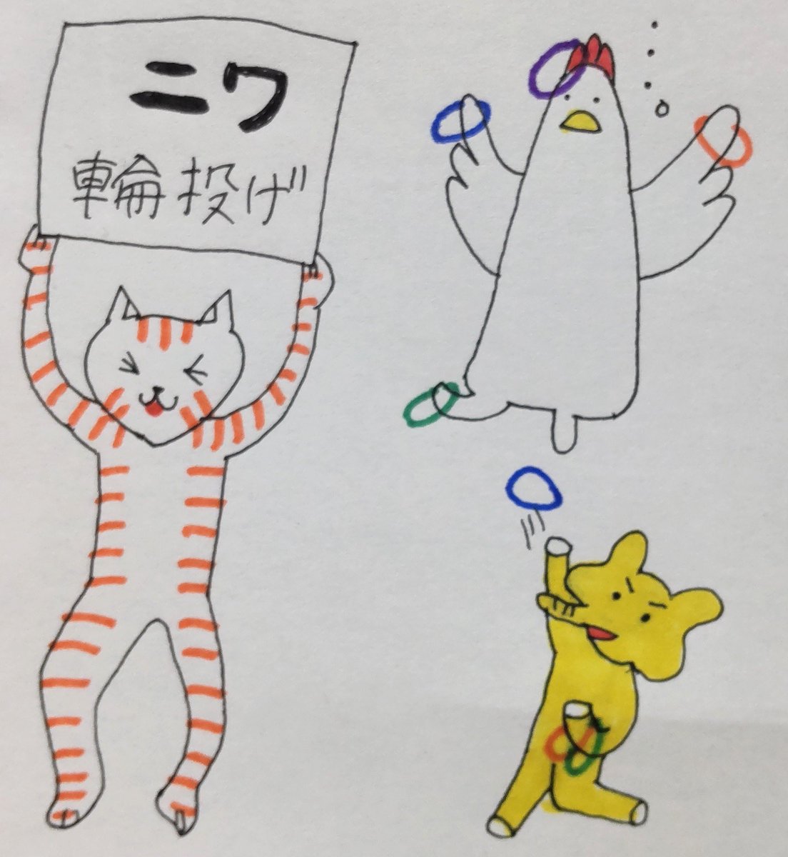 おはようございます!! #ラッキーゾーンの日 ニワ輪投げ!!トサカに上手く入れば 大当たりです!!頑張ってね!!😉 今日も素敵な木曜日を〜🤗 #イラスト好きさんと繋がりたい #絵描きさんと繋がりたい #みんなで楽しむTwitter展覧会 #イラスト
