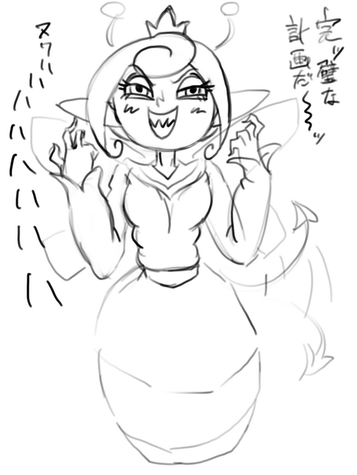 #ラフ絵を貼ると相互が完成させてくれる ヴィラン笑いの暴食魔王~~~~ 計画を実行中に満腹になって放り出すの。ばいきんまんと組んでたりしたら、アンパンチを阻止する魔法を発動し忘れて終わっちゃう感じで…。
