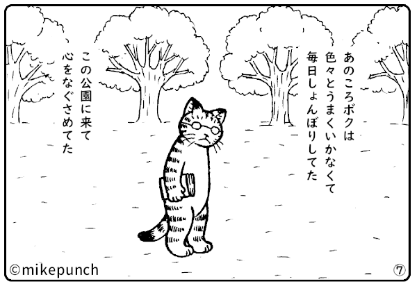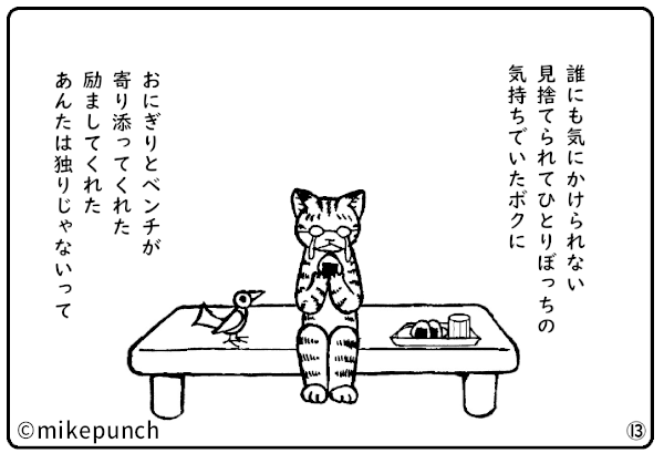 「おにぎり猫のものがたり」 第二十五話 おにぎりの奇跡 note.com/mikepunch/n/n4… mikepunch.net/onigirinekosta… 小梅の店にやってきた夫ノリオ。 ベンチに座っておにぎりを食べながら昔を思い出します。 あたたかいラブストーリー。 #漫画が読めるハッシュタグ #おにぎり猫のものがたり #ラブストーリー
