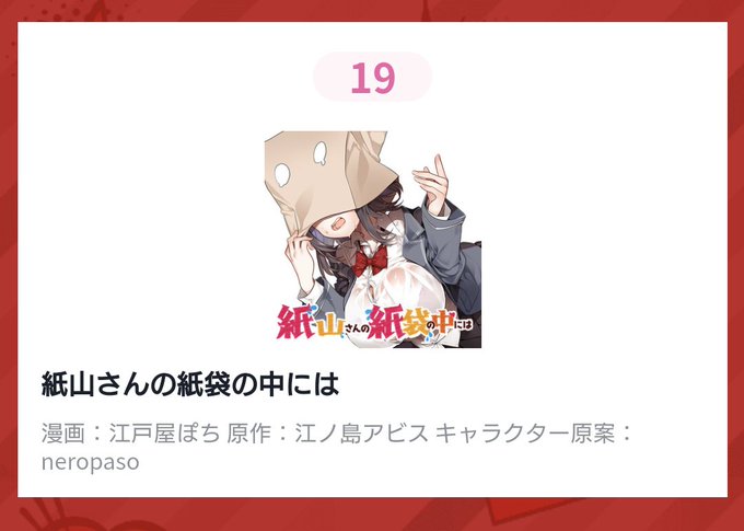ニコニコ漫画 年間ランキング2021 公式マンガ部門ベスト100を発表!ニコニコ漫画で公開されている5,600以上の公式マンガから、2021年の人気上位100作品になったのは!? 紙山さんの紙袋の中には ✨🎉19位ランクイン🎊✨ 有難うございます!! site.nicovideo.jp/nicomanga/wint… #ニコニコ漫画 #ランキング