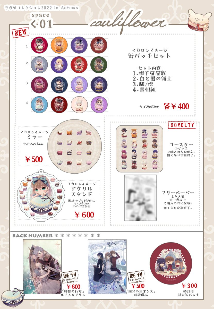11/3開催イベントのお品書きです。 【く01】にて新しいグッズや既刊などを持ち込む予定です。 当日はよろしくお願いします! 既刊サンプル ルイアリ→cauliflower.booth.pm/items/3614254 時計塔→cauliflower.booth.pm/items/3823672 #ラヴコレ2022秋 #ラヴコレ2022秋お品書き