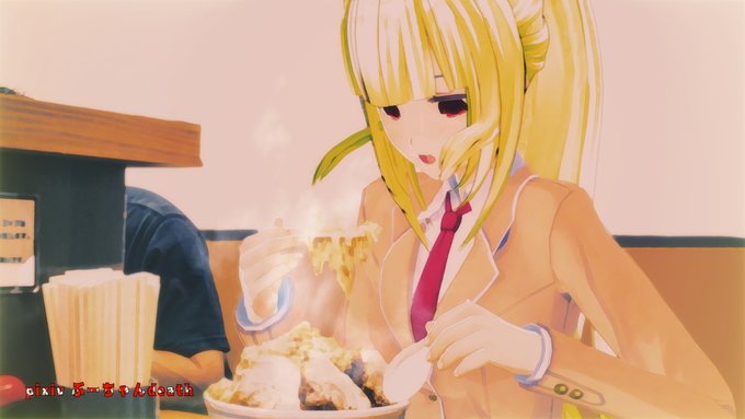 ラーメン大好き_(┐「ㅌ:)ノ ͟͟͞͞🍜 #pixiv今日のお題 #料理 #食事 #ラーメン #ラーメン大好き小泉さん #カスタムキャスト #金髪 #ポニーテール pixiv.net/artworks/97990…