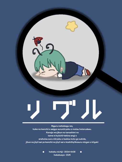 6月4日は虫の日です(゚д゚)(。_。)ウン | タロウぽん #pixiv pixiv.net/artworks/10873… リグルごめんね (。・x・)ゝ忘れてた #東方Project #東方絵描きさんと繋がりたい #リグルの日 #リグル・ナイトバグ なんとか今日中に、上げました(;・∀・)