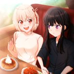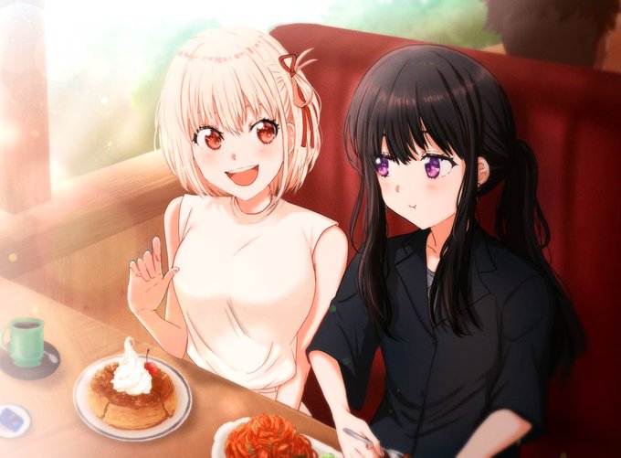 「時間です、移動しましょう」 #リコリコ #リコリス・リコイル #リコラジ #ちさたき 次のシーンでリスみたいに口をパンケーキでいっぱいにしていた千束ですが、その前にこんなシーンがあってもいいなー、と思って描きました。 背景は #dreamstudio に描いてもらって加工しました。