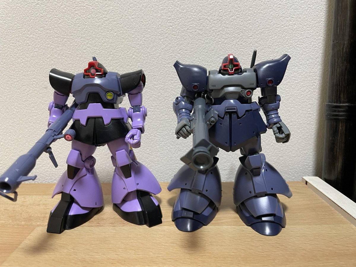 部品統一化したとはいえ……変わりすぎでは? 揃ったので 前期型と後期型(統合整備計画後の機体)と並べる #ガンプラ #ガンプラ好きと繋がりたい #ガンプラの画像貼るとRTされると聞いて #リック・ドム #リック・ドムII