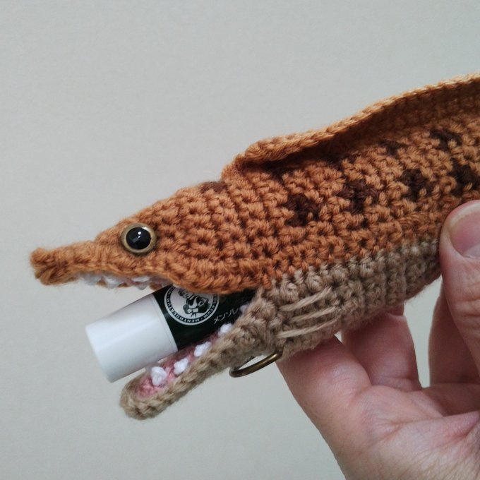 #リップケース は #ウツボ の他に #アノマロカリス と #モササウルス がおります。 本日、1期最終日は15時までー! #あみコレ勝手に応援団 #あみコレ2022 #あみぐるみコレクション2022 #あみぐるみ